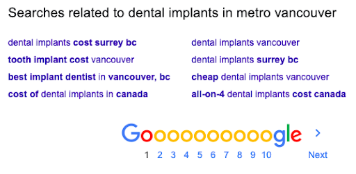 If your type “dental implants in Metro Vancouver,” you will see a common question about the cost. If you can answer this question in text and video, your website is sure to rank higher as Google wants to show better results to user-specific queries.